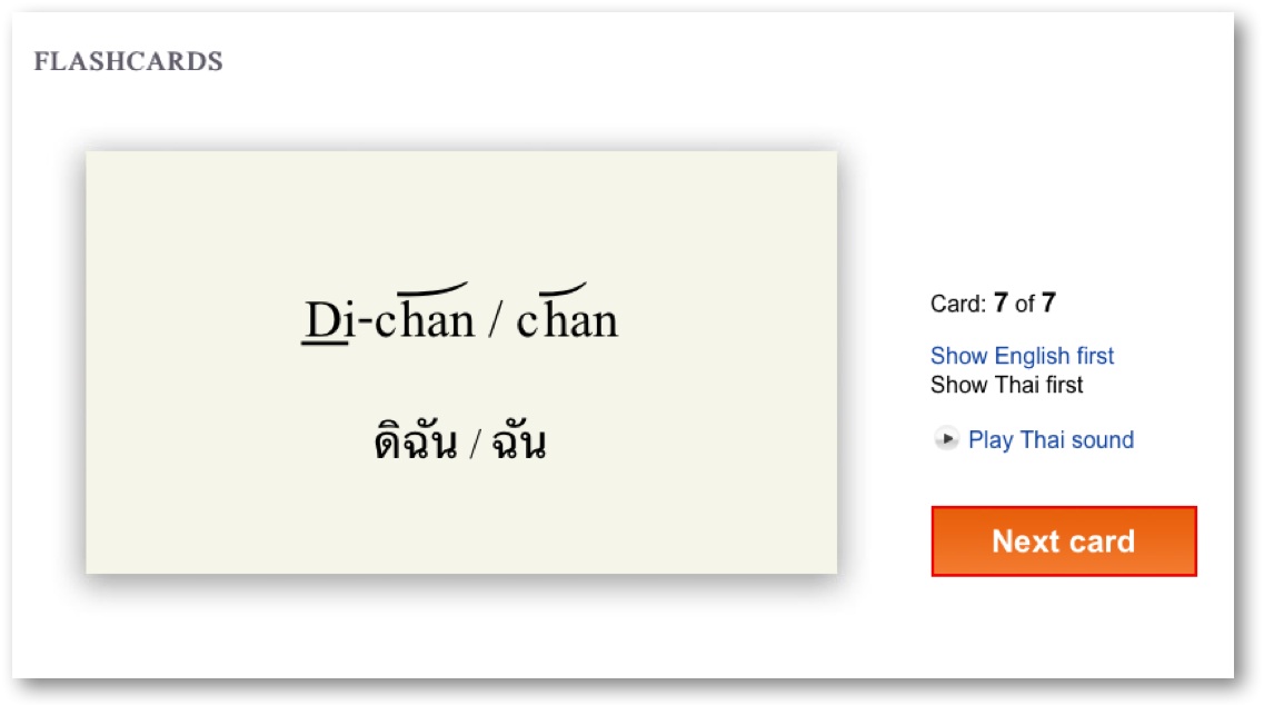 Games are found at the bottom of the lesson. Click on the game you want to play. To play the flash card game click on the card to flip it. The flipped flash card automatically reveals the Thai word and plays the Thai audio. To go to next card click 'Next card' button.